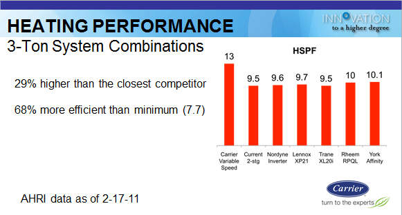 The new infinity heat pump with Greenspeed intellligence is the highest heating efficience residential air source heat pump available on the market today. In the commonly sold 3-ton size, consumers will enjoy a heating efficiency rating 29 to 69 percent higher than other air source heat pumps on the market today.